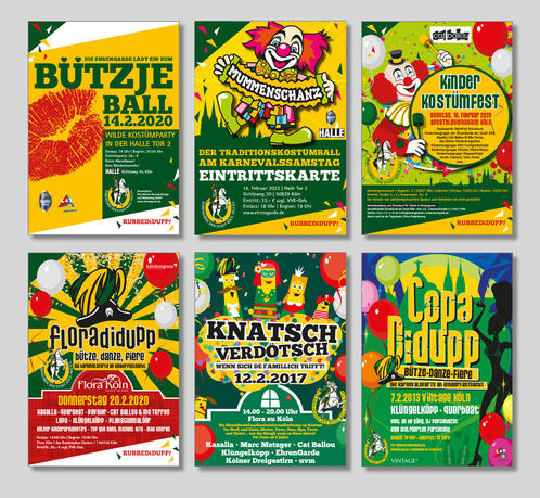 Key Visual Mummenschanz, Key Visual Floradidupp, Key Visual Bützje Ball, Key Visual Knatsch Verdötsch, Key Visual Kinderkostümfest, Key Visual Ehrensache; Einladungen, Give-Aways, Eintrittskarten, Fahnen, Banner, Geschäftsausstattung, Screen Design, uvm.